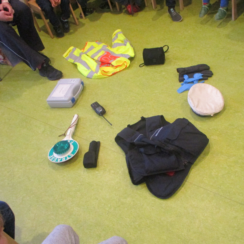 Mit viel Zeit, Geduld und Engagement hat sie den Kindern einen spannenden Einblick in ihre Arbeit gegeben. Die Kinder konnten die Ausrüstung der Polizei hautnah kennenlernen und auch selbst entdecken. Besonders interessant waren die Handschellen, die Stoppkelle (Stop-Ampel), die Schutzweste sowie viele weitere Gegenstände, die Polizistinnen und Polizisten im Alltag nutzen.